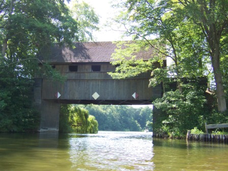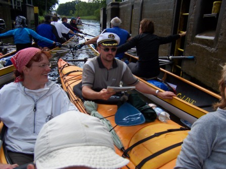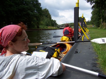 Am Morgen wird alles verpackt und es geht los. Schon nach gut 2 km erreichen wir die Schleuse Canow. Recht neidisch schauen die Bootsführer der großen Schiffe, wie wir bis kurz vor die Schleuse paddeln und auf den Wink des Wärters in die Schleuse fahren neben und hinter die 3 oder 4 Großen. Das Einrangieren dauert wegen 3 Ruderbooten etwas länger, die sind doch recht sperrig.
