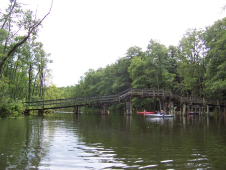 An der Umtragestelle erwartet nun auch uns ein Stau, es herrscht starker Andrang und die mit Gepäck beladenen Boote sind auch bei ordentlichem Steg nicht so schnell rausgenommen. Nach kurzer Zeit sind wir aber an Land und Dank eigenem Bootswagen sind wir auch zügig vom Nadelöhr verschwunden. Ansonsten kann man hier auch einen Bootswagen leihen.