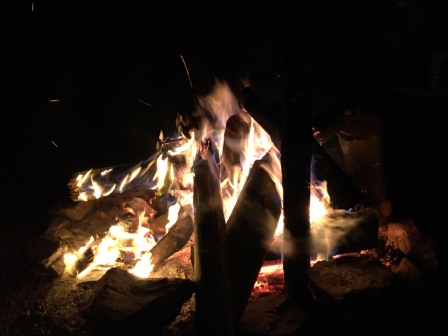 Die letzten Stücke des am Freitag geworbenen Holzes liegen im Feuer und bringen ein wenig Licht nach dem Trocknen ins Dunkle der Nacht.