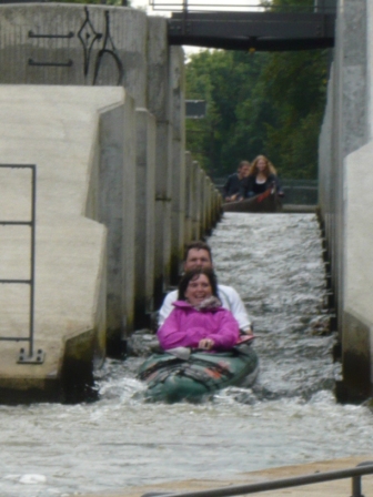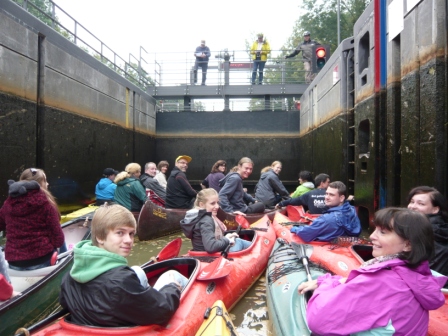 Es dauert, eilig hat man es nicht. Dann endlich wieder auf dem breiten Fluß kommen wir gut voran. Nach knapp 2km biegen wir rechts in den Floßgraben ein. Ab hier wird richtig schön. Man schlängelt sich auf dem Wasser und glaubt kaum, dass man eigentlich in einer Großstadt unterwegs ist. Bei der Einfahrt in den Waldsee Lauer sammeln wir uns. Wir halten uns auf der linken Seite des Sees und finden die schmale Ausfahrt zum Cospudener See. Die automatische Schleuse Cospuden mit 4 (!) Bediensteten nimmt uns auf. Wir werden auf den Nutria Willi aufmerksam gemacht, der mit Brot zum Schauessen für uns Paddler verführt wird. 200 Meter weiter sind wir auf dem See und biegen gleich nach links zur Badestelle fürs Picknick ab. Ein kleines Hüngerchen haben alle und alle haben wieder viel zu viel mit. Steffen übt wehrend der Pause noch das Steuern eines Kanus als Einer. Zum Glück hat er trockene Sachen mit, die er dann auch braucht.