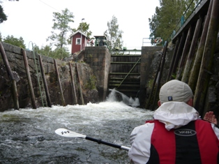 Der Wind ist nicht weniger geworden. Vorsichtshalber machen wir die Spritzdecken schon mal drauf. Unter Land können wir dem böigen Südwestwind im Harnäsfjorden entgehen. Aber dann Gegenwind, das Boot platscht auf das Wasser und ich bin oberhalb der Spritzdecke platsch nass. Jetzt brauche ich auch keine Regenjacke mehr anziehen. Während wir so mit Macht gegen den Wind paddeln landen wir in einer Bucht, in die wir gar nicht wollten, umdrehen und zurück. Die zwei Kilometer zur Schleuse sind dann richtig anstrengend geworden. Bei einigen Böen ist es schwieriger das Paddel oben durch die Luft als unten durchs Wasser zu bekommen. Mir haut es einmal sogar das Paddel aus der Hand.
