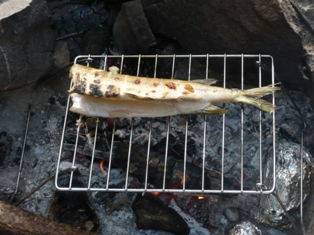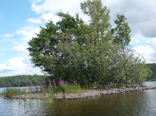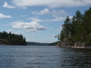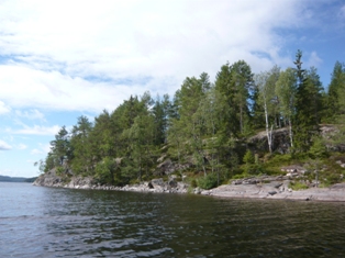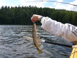 Wir halten den uns links und fahren in eine gut 6km lange Bucht in Richtung Vageln. Mittlerweise ist die Sonne wieder draußen. Die Plätze 87 und 88 sind schon/noch belegt. Ganz schmal mit steil aufragenden Felsen sind für mich der Schönste Bereich, den wir bisher gesehen haben. Ich werfe die Angel aus und wir schleppen den Blinker hinterher. Es dauert nicht lange und der erste kleine Barsch hängt am Haken, befreit sich aber gleich wieder. 10min später hat der nächste Barsch angebissen. Er darf wieder ins Wasser. In der nördlichen Spitze der Bucht kommt dann ein kleiner Hecht nicht an meinem Schleppköder vorbei und verschlingt ihn bis zum Anschlag. Ich hätte ihm ja die Freiheit geschenkt…aber der Haken saß so tief, daß der Kopf ab musste. Raus aus der Bucht gab’s jetzt Südwestwind. Wir halten genau auf die 85 (Bada-Süd) zu. 100 m weiter liegt die Hütte 84 (Bada-Nord) direkt am Strand. Da wir freie Auswahl haben, entscheiden wir uns für die 84. Feuer gemacht, den Lachs von der Schleuse mit Backkartoffeln aus der Feuerglut. Solchen Fisch haben wir noch nie gegessen. Einfach köstlich. Der kleine Hecht landet auf dem Grill, da wir eigentlich schon satt sind, fällt er beim Geschmack (und die kleinen Gräten) doch ab. 6 Belgier kommen etwas später und platzieren sich ein Stück weiter. Dann stellt sich ein richtiger Schwede vor(der erste und einzige den wir bei paddeln trafen), der mit zwei Freunden unterwegs war. - Alles nette Leute.