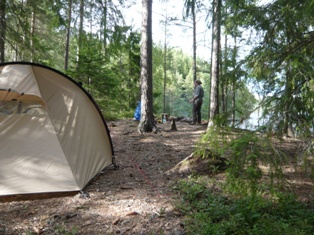 Auf dem Rückweg strahlt die Sonne nur der Wind nimmt langsam zu. Am Rastplatz 91 liegt noch kein Boot. Bei der Besichtigung stellen wir aber fest, daß schon ein Zelt an der Hütte aufgebaut ist. Kein Problem, es ist genug Platz für unser Zelt und eine wilde Feuerstelle ist auch vorhanden. Nachdem wir aufgebaut haben kommen die Eigner des Zeltes - vier holländische Jugendliche.