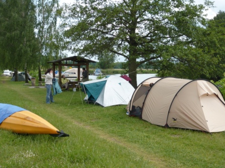 Wir kommen gegen 15:30 Uhr beim Kanuclub Malchin an. Man zeigt uns den Zeltplatz und wir bekommen noch Kaffe und Kuchen von der deutschen Jugendnationalmannschaft im Drachenboot, die sich gerade auf die Weltmeisterschaften vorbereitet. Wir sitzen in der Sonne und beobachten einige Trainingseinheiten aus der Ferne. Das Sanitärhäuschen ist sauber, komplett ausgestattet und es fließt auch warmes Wasser aus dem Wasserhahn. Zum Duschen braucht man eine Münze, die im Tausch gegen 50 Cent am Automaten vor der Tür erworben werden kann.