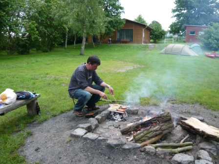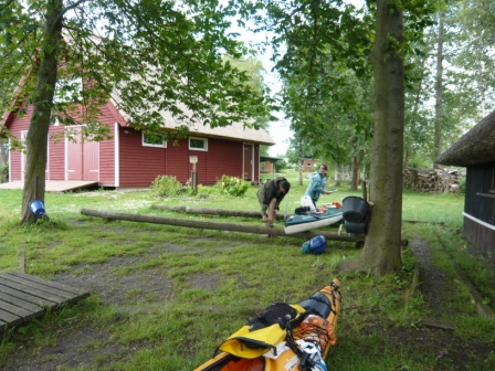 Am km 74,5 biegen wir in die Swinow ein. Jetzt sind es nur noch 1500 Meter bis zum Kanuclub Gützkow. Wir werden unheimlich nett aufgenommen. Die Mädchen wünschen sich die Unterkunft im Bootshaus auf dem Dielenboden (6€ pro Person), da es nicht nur wärmer sondern auch trockner ist. Es soll ja wieder die ganze Nacht regnen. Tut es aber nicht. Es wird ein schöner Abend mit lecker Sachen vom Grill!