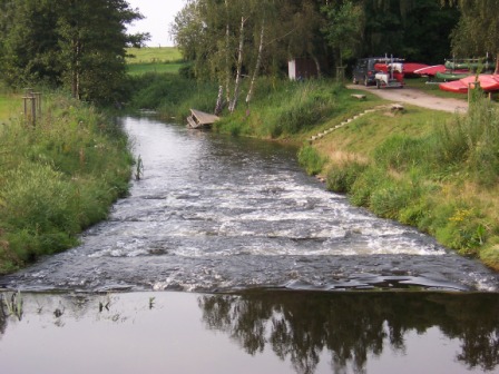 - eine kleine orangegelbe Boje markiert den Zugang zur Warnow. Kurz darauf ist auch schon das erste Wehr (Kobande) umzutragen.