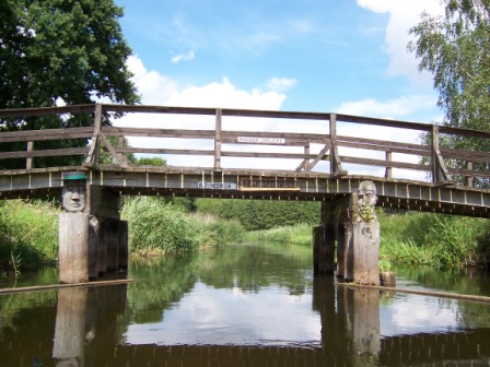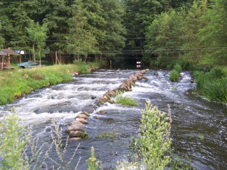 - Mit unguten Gefühlen fahren wir auf den Kilometer mit den von www.flussinfo.net beschriebenen Felsen und Schnellen des Warnowdurchbruchtales zu. Eine kleine Holzfußgängerbrücke trägt auch noch mit den dazugehörigen Brückenpfeilern zum sehr anspruchsvollen Kurs bei. Auch hier sind Grundberührungen nicht zu vermeiden.